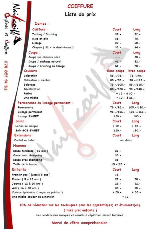 Parce que chaque personne est unique, nous prenons le temps de vous offrir un service personnalisé et de qualité. Découvrez ci-dessous l’ensemble de nos prestations et leurs tarifs pour sublimer vos cheveux.