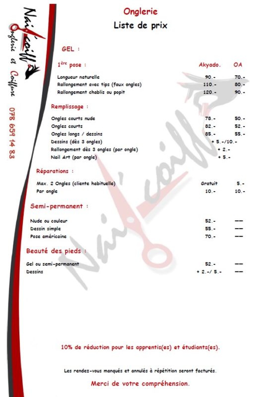 Offrez à vos mains et à vos ongles un moment de soin et d’élégance. Retrouvez ci-dessous nos différentes prestations ainsi que leurs tarifs pour des ongles soignés et raffinés.